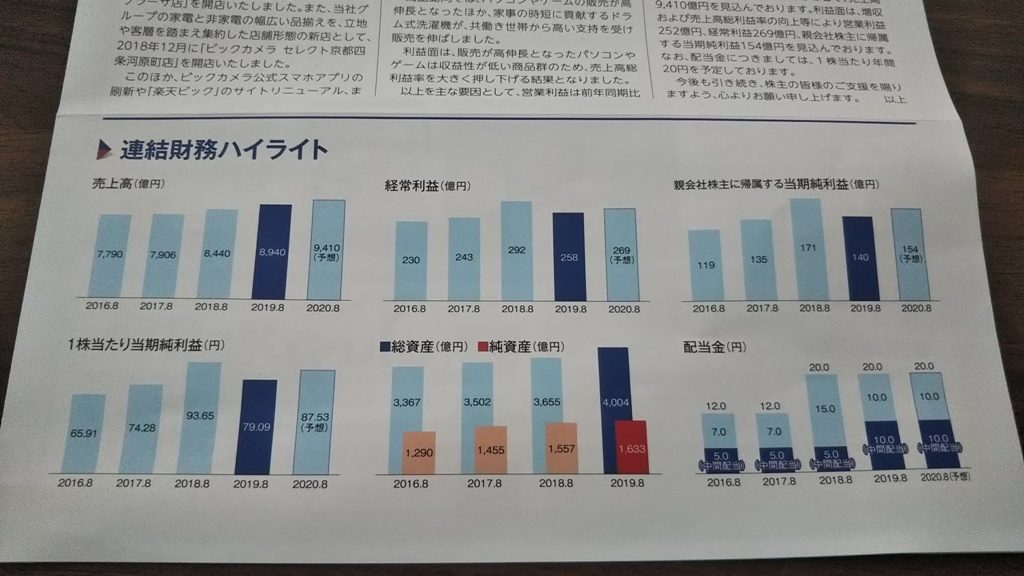 売上が過去最高だが、利益伸びず。家電量販店からの脱皮を続けている、店舗数が少ないし、内需なので大きな失敗は無いと思っている。旧コジマとソフマップが潜在的な爆弾。後はネット通販でポジションを築けるか、楽天などとの連携でAmazon対抗という戦略が見える。小売らしく規模を追い続けているが、どこまで規模を追求するのか?