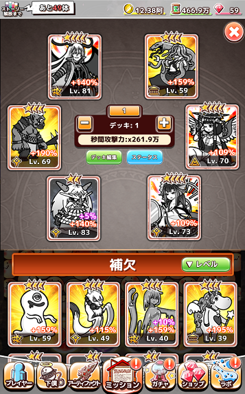 クリアには下僕のレベルを上げる事、タイムエンペラーを組み合わせたスキルを引く事。下僕のレベル上げは70を超えた辺りから苦行になる、X9からX0に上げる際の上昇幅が大きいので積極的に狙う。最終的に、下記でクリア。メデューサのボス戦で+3秒スキルが大きかった。左側は同系統で一発の火力重視で揃えた。