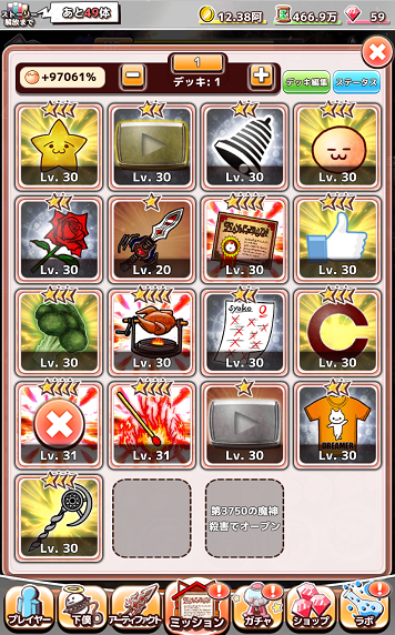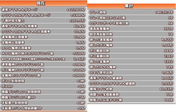 統計。コインよりも素材集めのためにチラシや動画広告クリックする事になる。レベルアップに必要なコイン数は指数関数的に上昇するので、金魔神が出ようがコインドロップ数を多少上げた所で大きな効果は無い。とにかく時空再起動を繰り返して、下僕とアーティファクトのレベルを上げた方が良い。